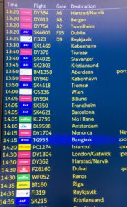 Hardt og brutalt starta det då billetten sa eg kunne pakke 30kg, men dama i skranken slo fast at grensa låg på 23kg. Enda meir brutalt vart det då ho fortalde at flyet til Oslo var innstilt, og eg måtte vente 5 timar på neste, som igjen ville føre til at eg mista resten av flya mine. Stressnivået på Haukåsen var høgt og ingen hadde tid til å gi fleire svar, eg fekk berre sitte å vente på ny beskjed.