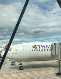 Flyturen var lang nok på ca. 10 timar, med masse turistreklame og flyvertinne som bytta antrekk fleire gangar. Forlot Norge midt på dagen, og landa i Thaithai tidleg morgen.