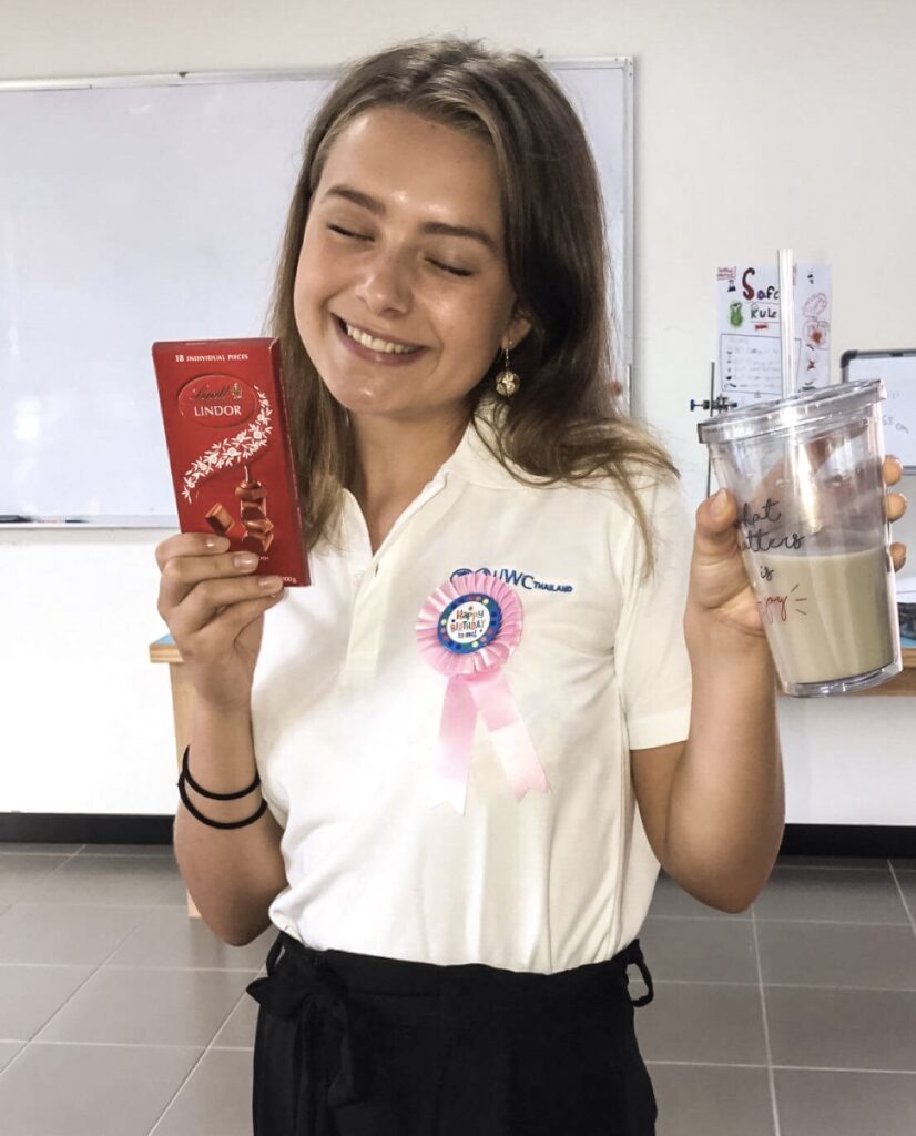 Eg kom inn i kantina til bursdagssong til frokost, kom inn til bursdagssong til Homeroom, kom inn til bursdagssong til snacks og til Lunsj. Gikk rundt å nynna for meg sjølv heile dagen. Linda fra Belgia og Venezuela ga meg ein button som eg gjekk rundt med resten av dagen. I tillegg festa eg ein ballong til skulesekken min, og følte meg som den ultimate lykkelige 3-åring.
