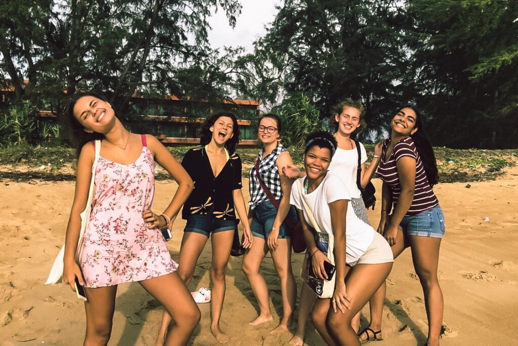 (F.v) Arianna frå Italia og Slovenia, Maya fra USA og UAE, Julie fra Ungarn, Leigha fra Jamaica, Betül fra Tyrkia og Karla fra Venezuela