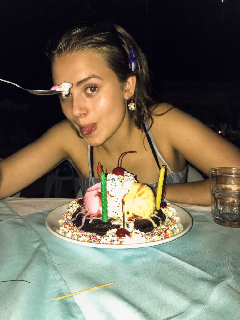 Ekte thai cuisine kanskje jeg vet ikke, eg fekk cashew fried rice servert i ananas, og smakte naturligvis på alle sin mat. Peanøttsaus, vårrulla, pad thai og ellers herlegdom. Vi skulle akkuratt til å pitle heimover då servitørane hadde fått tips fra en liten fugl om anledingen og kom syngjane med ein kake-is-krem-strøsselformasjon<3