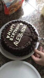Rundt klokka 6 vekte roomies meg opp med sang og kjeks på senga, klemma, «tradisjon» og ei «overrasking» som gjekk ut på at eg med bind for augene fumla meg fram til døra, åpna den og fann ei relativt stor pappøskje. Ut av den spratt Arianna fra Italia. «I am the present! I am so funny»